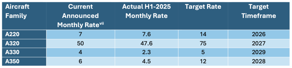 There has been no change in Airbus’s medium-term production plans (the current production figures in the table above include some external estimates as well as official Airbus guidance).