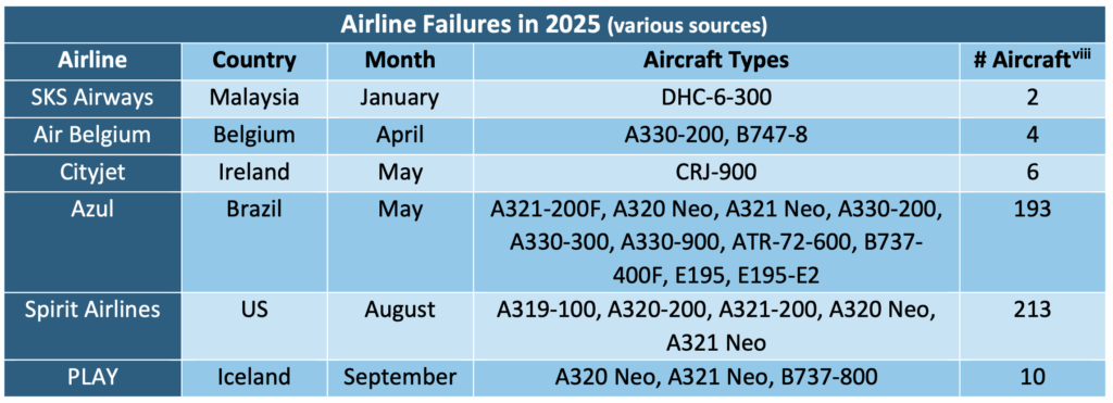Very few small airlines have failed so far this year, and our historical analysis suggests that there will be more financial distress over the rest of 2025 for this category of airline than has occurred to date. The table below omits two very small airlines that were reported as failing, Bees Airlines of Romania (January) and RAVN Alaska (August). In neither case was it possible to identify any aircraft they operated as of year-end 2024.