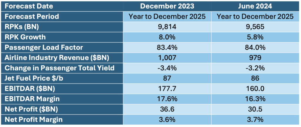 IATA released a new airline industry financial forecast in June 2025 as part of its semi-annual Global Outlook for Air Transport. The table below compares key forecast outputs for 2025 with IATA’s previous forecast published in December 2024.