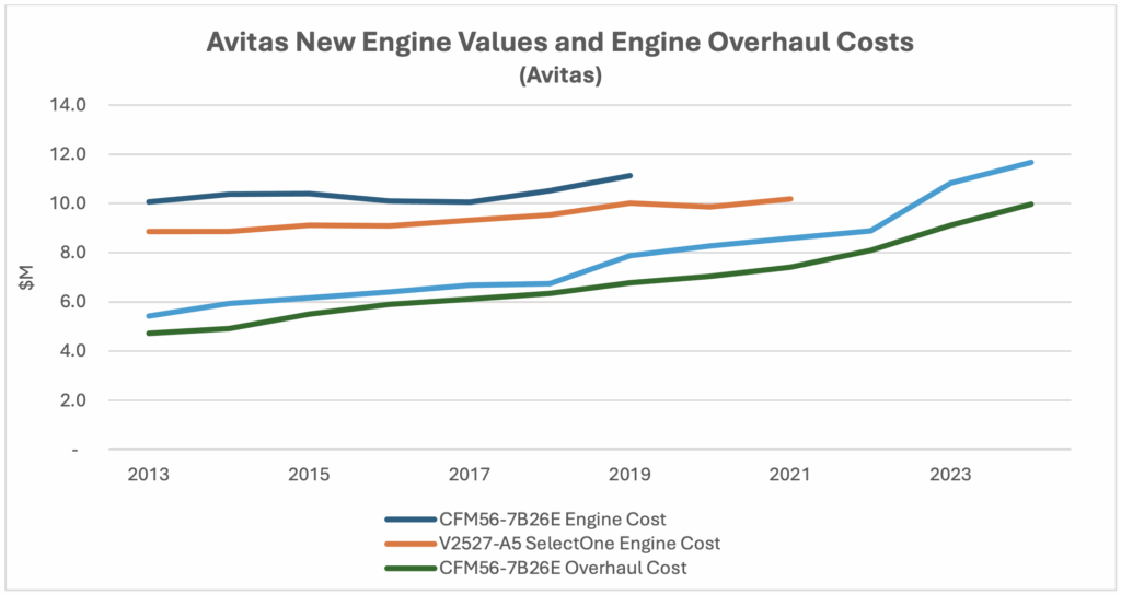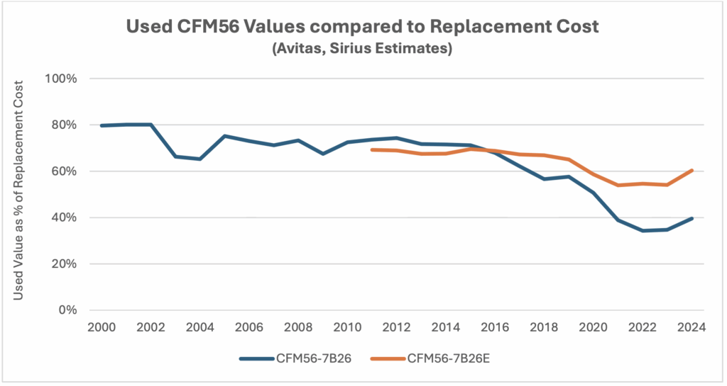 We can see some possible evidence of this when we compare used engine values over time with their replacement cost. The replacement cost used when an engine ceases production is a percentage of its successor type – this is normally a reasonably objective number as the two engines are often sold side by side for several years. For the engines in the chart below the CFM56-7B26 is c. 90% of a CFM56-7B26E and a CFM56-7B26E is c. 78% of a Leap-1B27.