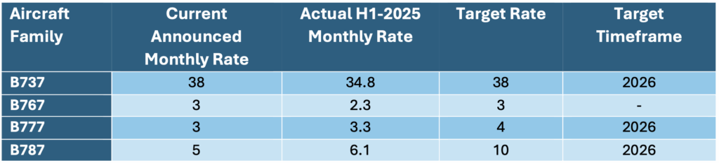 Boeing’s deliveries increased significantly year-on-year across all aircraft programs. Also, there is a lot more clarity around actual production rates, so we have stopped estimating production rates adjusted for movements in inventory. At the end of June, the B737 rate was at its target level of 38 and aircraft in inventory were 20 in production variants due for delivery to Chinese airlines by year end 2025 and c. 35 -7 and -10 variants awaiting certification sometime in 2026.Further increases in the B737 production rate are subject to FAA approval and Boeing has not provided a definite timeframe for when they will occur, but management has said they expect future increases to come in increments of 5 aircraft per month.