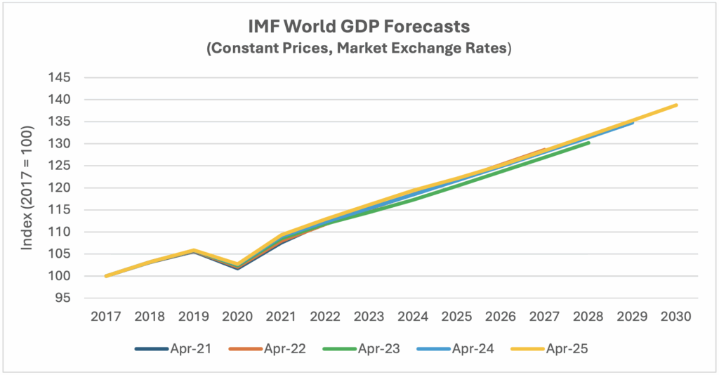 Despite the “trade wars” initiated by the US this year the IMF has not materially changed its World GDP forecast in its latest World Economic Outlook published in April 2025, and its first forecast for 2030 shows a similar level of growth to prior years. In its July update the IMF tweaked its forecast for 2025 and 2026 slightly upwards, by 0.2% and 0.1% respectively.