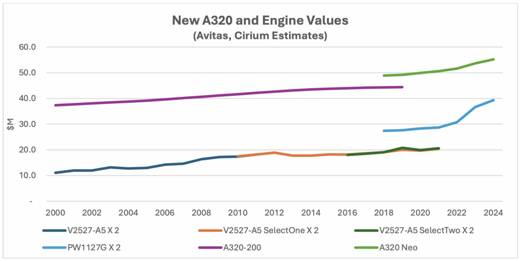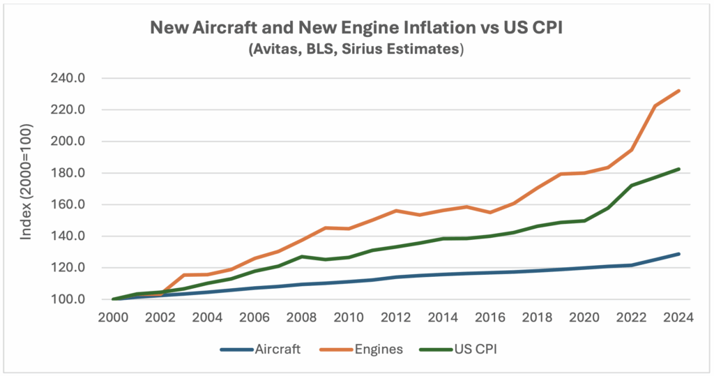 The differences between aircraft, engine and general inflation are significant with CAGRs of 1.1%, 2.5% and 3.6% respectively from 2000 to 2024. They are most readily explained by the competitive dynamics that prevail when aircraft and spare engines are sold. Every new aircraft sale is a competition whereas a new spare engine is often sold to a buyer that does not have a choice. We should bear in mind that most new spare engines are sold as part of an order for new aircraft and thus benefit from a significant discount although there are meaningful sales to airlines and other customers such as engine lessors where such a discount would not apply.