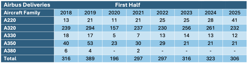 Airbus delivered slightly fewer aircraft in H1 2025 than in H1 2024 mainly due to continuing supply chain constraints which were aggravated by the acceleration of some CFM International LEAP engine deliveries into Q4 2024 to meet last year’s delivery target. Airbus stated that they had roughly 60 A320 family “gliders” at the end of June, that is to say airframes that had been completed but with no engines available to allow them to be delivered. Despite these problems Airbus has maintained its guidance at 820 deliveries in 2025.