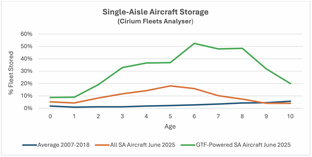 As of June 2025, there were 976 single-aisle aircraft in storage of which 747 were GTF-powered. The vast majority of these aircraft would be flying if there were enough spare engines.