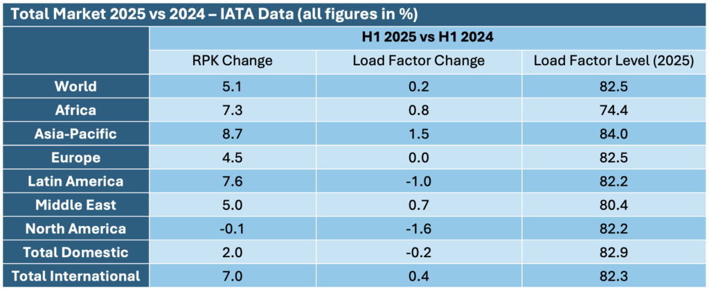After a very strong start traffic growth weakened throughout the first half of 2025. Year on year growth for the month of June was only 2.6%, although RPKs[5] for the first half overall were up 5.1% and a slightly lower increase in ASKs[6] allowed for a modest improvement in load factor. The key growth driver was international traffic in Asia-Pacific which has lagged other markets in its post-pandemic recovery. This was significantly offset by weakness in both domestic and international North American traffic where volatile economic policy in the US appears to have had a negative impact on consumer confidence.